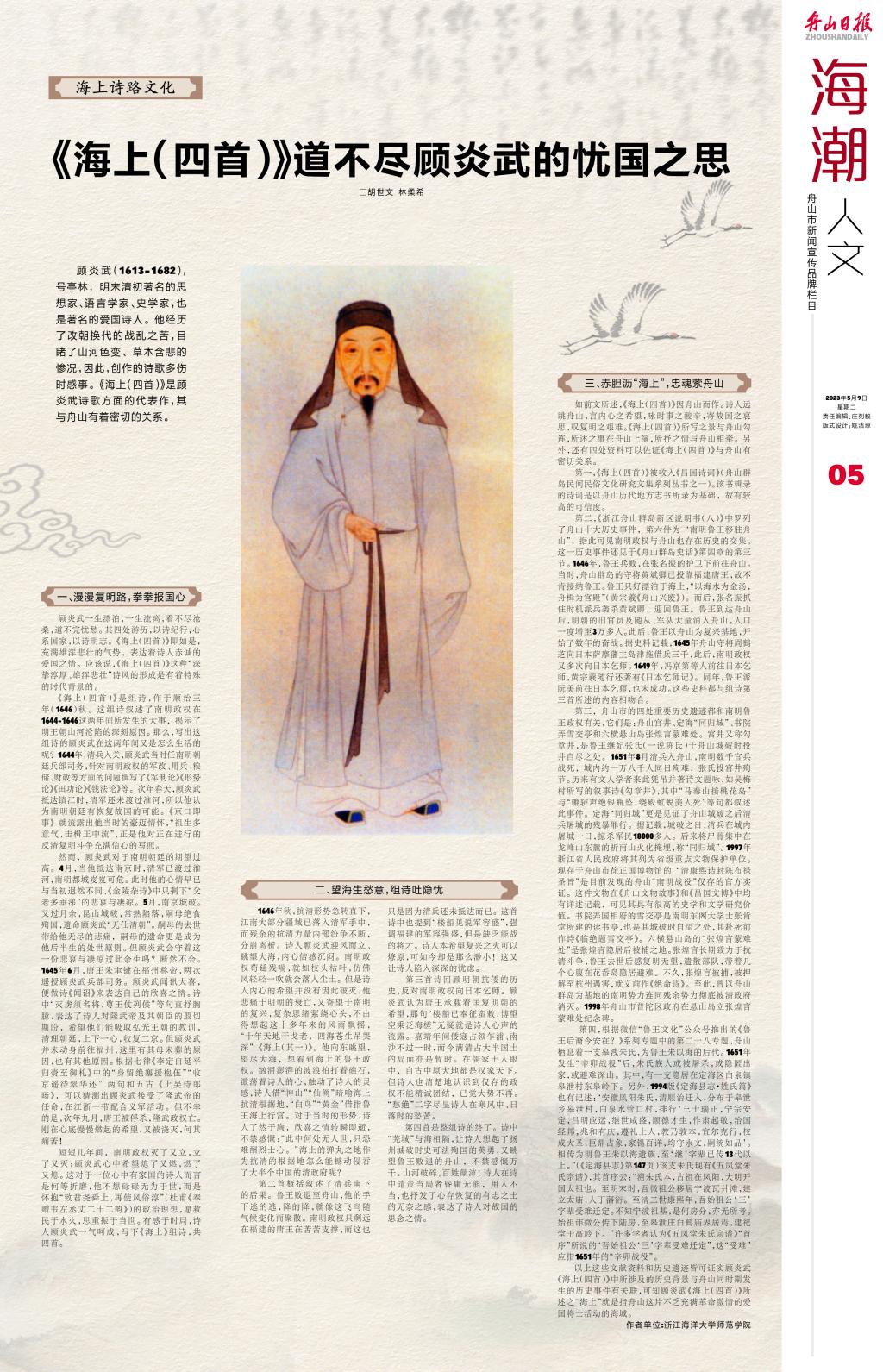 5月9日,《舟山日报》第05版“海潮人文”刊发学院胡世文教授、Y22级研究生林柔希的文章《<海上(四首)>道不尽顾炎武的忧国之思》。