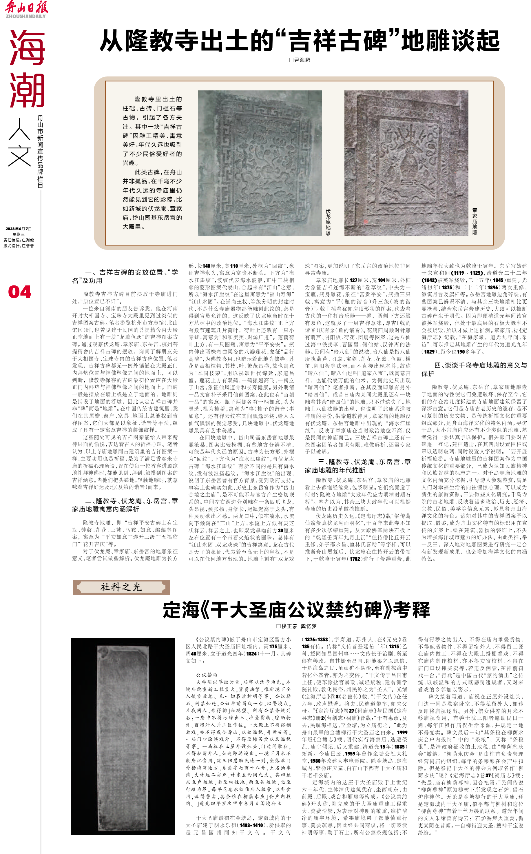 6月7日,《舟山日报》第04版“海潮人文”社科之光栏目刊发学院楼正豪副教授、舟山市汉文化协会会长龚忆梦的论文《定海<干大圣庙公议禁约碑>考释》。